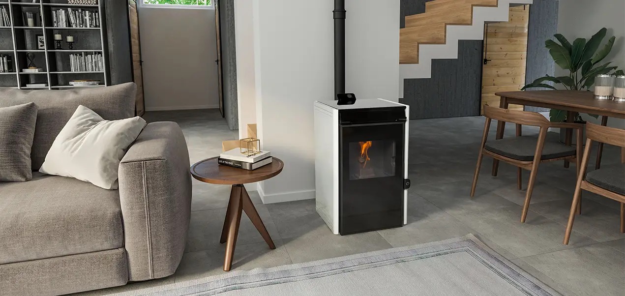 Estufa de pellets de aire compacta (6 kW) con rendimiento del 91 % y Wi-Fi. Perfecta para viviendas pequeñas o Passive House.